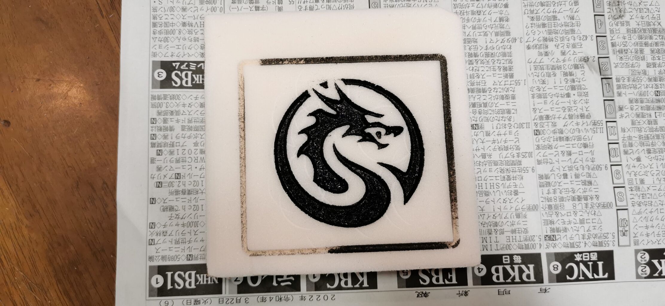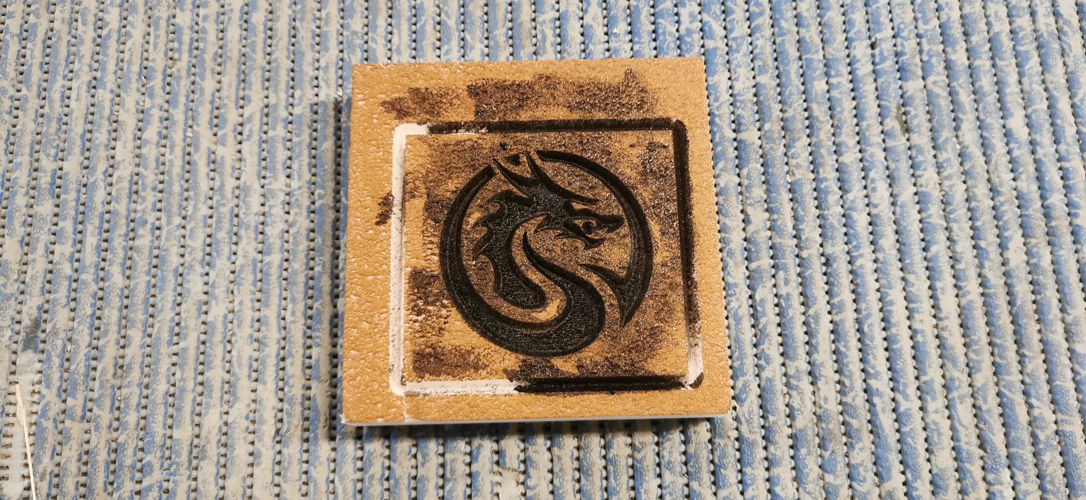 DXFはCorelDRAWで作り、F-EngraveでGコードを作り、C-Beam Machine(剛性強化版)で削って凹の所に色を付けたあと、表面を平らにしたものが上の写真。