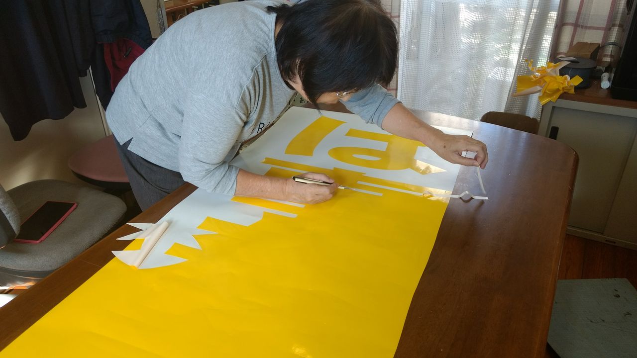 降ろしたら結構でかく、70cmX5m。カッテングプロッタはあるのですが、こんなにデカイのを行うのは初めて。シートを買ってきて、下地を貼り、文字も貼りでした。文字は黄色の発色がよくなるように、白文字を貼って、その上に黄色を貼りました。石鹸水を作って、スプレーしてやりましたが、それでも、悪戦苦闘(^^;)