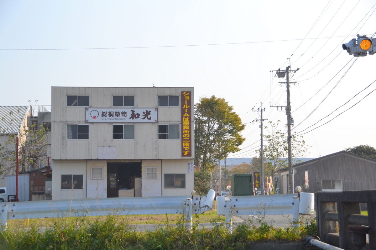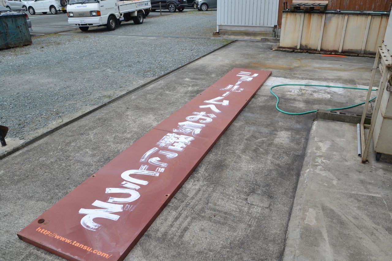 工場の北側です。こちらの方から、お客様はお見えになります。だいぶ以前に付けた看板が、ペイント描きで見るも無惨に。先の台風で塗装用の排気塔が壊れましたが、新品つけてもらった際に、高所作業車を持ってこられたので、その時に看板をハズしました。