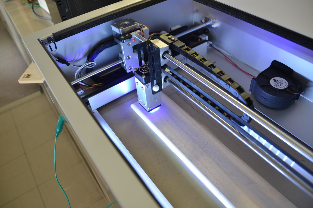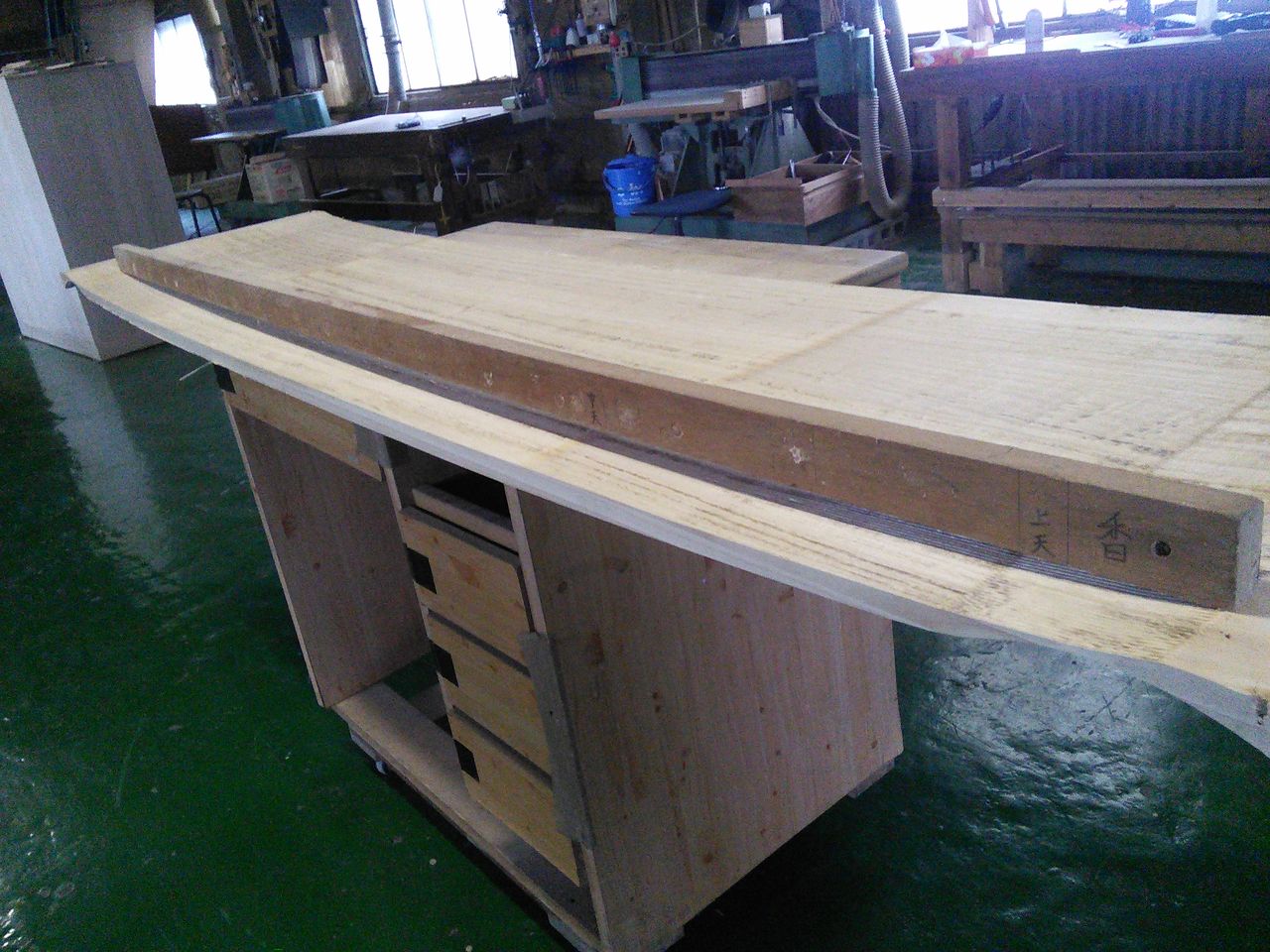 雑然としてますが、真ん中にあるのは卓上CNC。PC制御で加工できるマシン。数日掛けてやっと組立てた所。工場には大型の木工CNCがありますが、いろいろテストしようにも、かなりな電気を喰うのでやれずでしたが、こいつで思いっ切り遊んでみます(^_^
