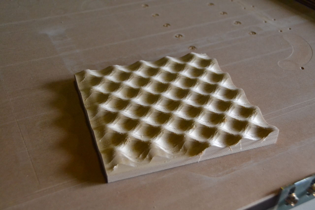 Fusion360+SHINX(木工NC)で、波型の自由曲面加工に成功(最下位写真)。