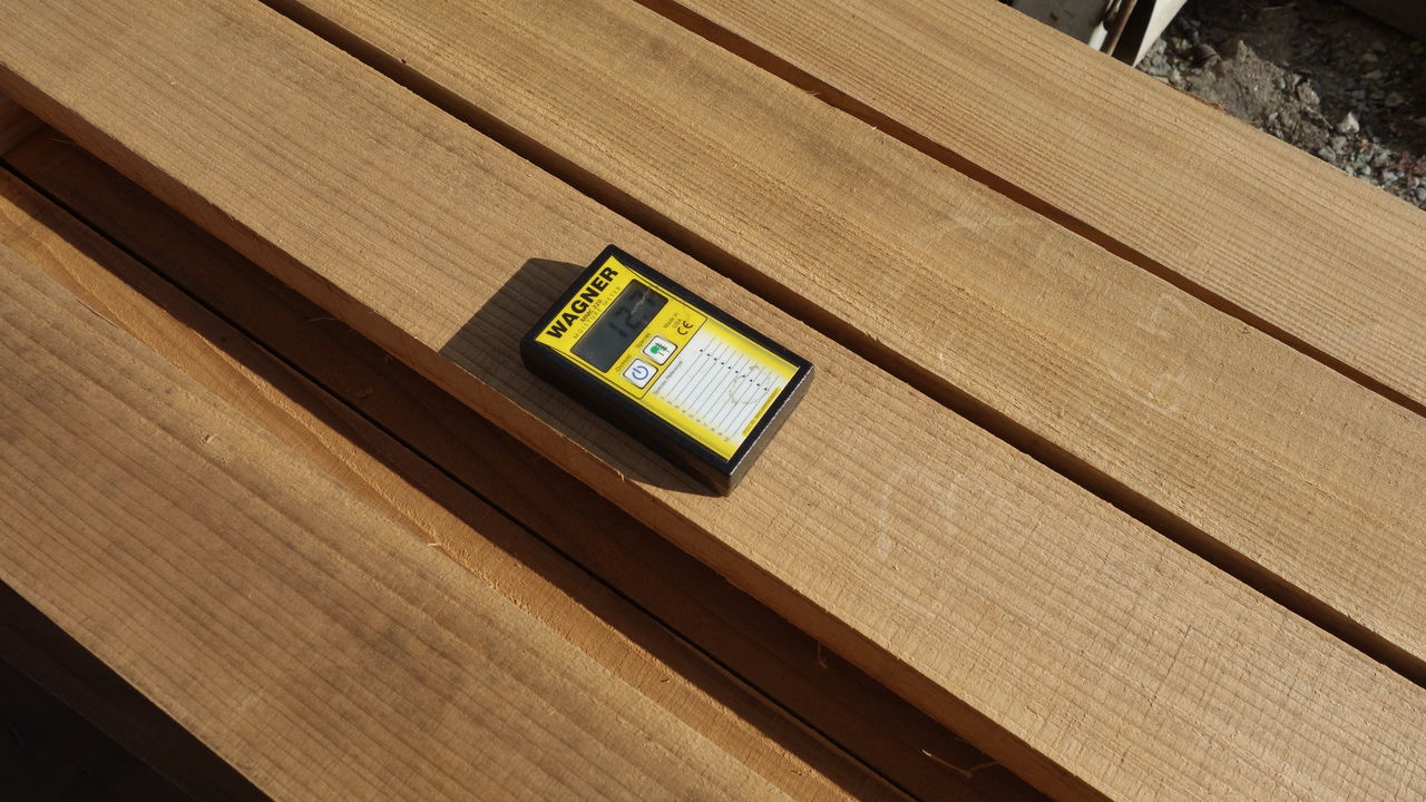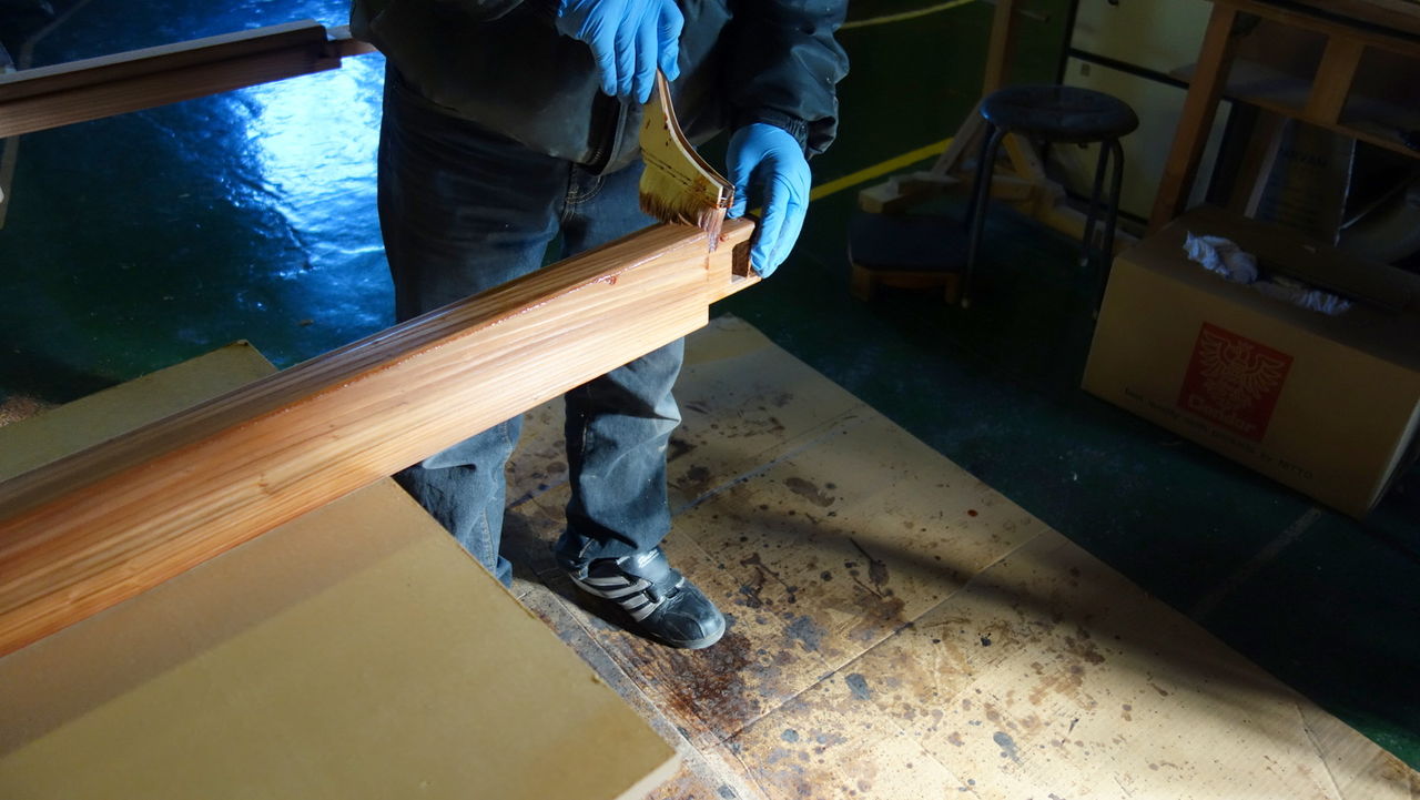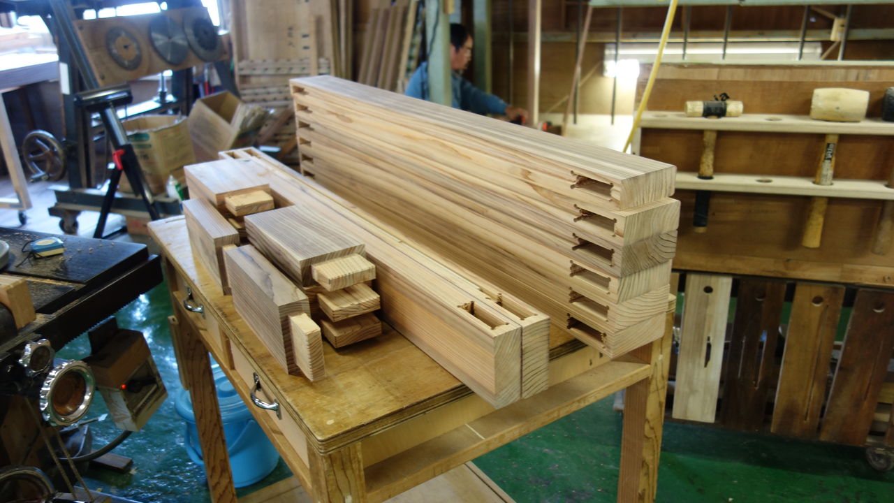 材料は化学物質過敏症の方から教えてもらった、杉の黒芯部分。今回は地元の八女市の杉を使います。接着剤にニカワ。加工はすべてホゾ加工+打ち込み栓、塗料は柿渋。床面は通気がいい、当社の実用新案を用います。