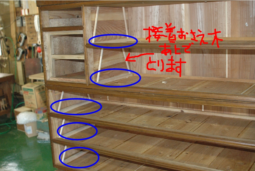 写真は再生(洗い・リフォーム)の箪笥をひっくり返しいるところです。青い丸で囲っているところは、材を接着している所です。なんでこんなところに材を足すかとと言えば、これがないと抽斗を手前に引いた時に、抽斗が斜めに下がったようになり使いづらくなるし、抽斗も箪笥も傷むのです。手抜きというか、忘れたのか、知らなかったのか分かりませんが、時々こういうのが舞い込んできます。