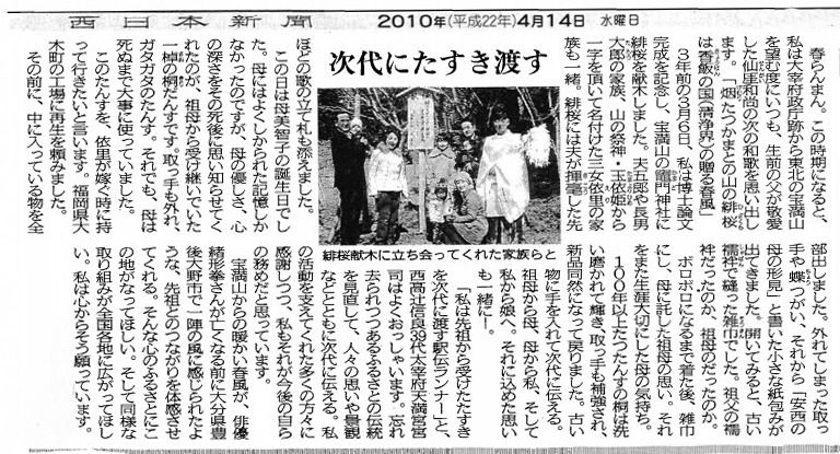ところで、ごく最近、別のお客様から、新聞に「たぶんお宅のことと思うが、、、」と記事をいただました。西日本新聞の今年の4月14日でした。著者名みて、すぐにあの方だと思いあたりました。桐んすの思い出が綴ってあり、祖母から母、母から私、私から娘へ。それに込めた思いも一緒にと。