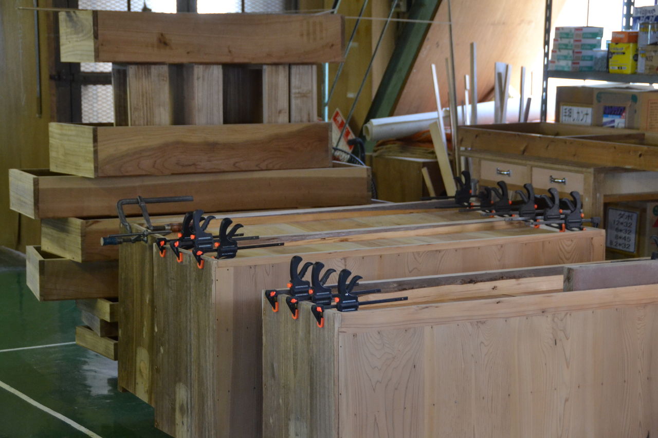 再生(洗い)しているところですが、クランプで止めているところは、お客様には見えない部分です。補強の為に材を接着しますが、いままでお使いしていた同年(50〜60年)は長持ちさせたいというところで、そういう風にしてます。